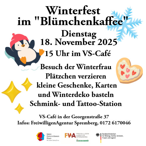 Kreatives mit unseren Bastelelfen, Verzieren von Plätzchen, Besuch der Winterfrau – das und mehr gibt es beim Winterfest im „Blümchenkaffee“.
