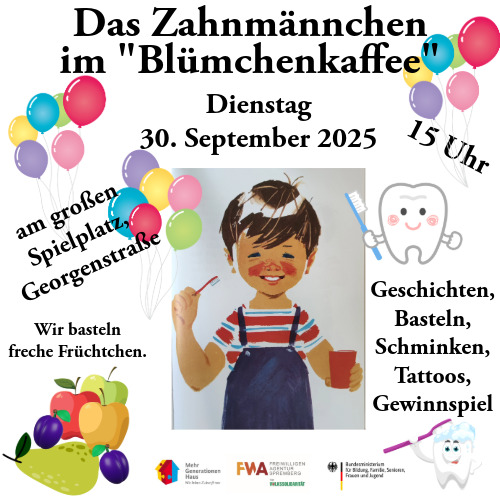Mit Spiel und Spaß geht es im „Blümchenkaffee“ am 30. September 2025 ab 15 Uhr diesmal um gesunde Zähne.